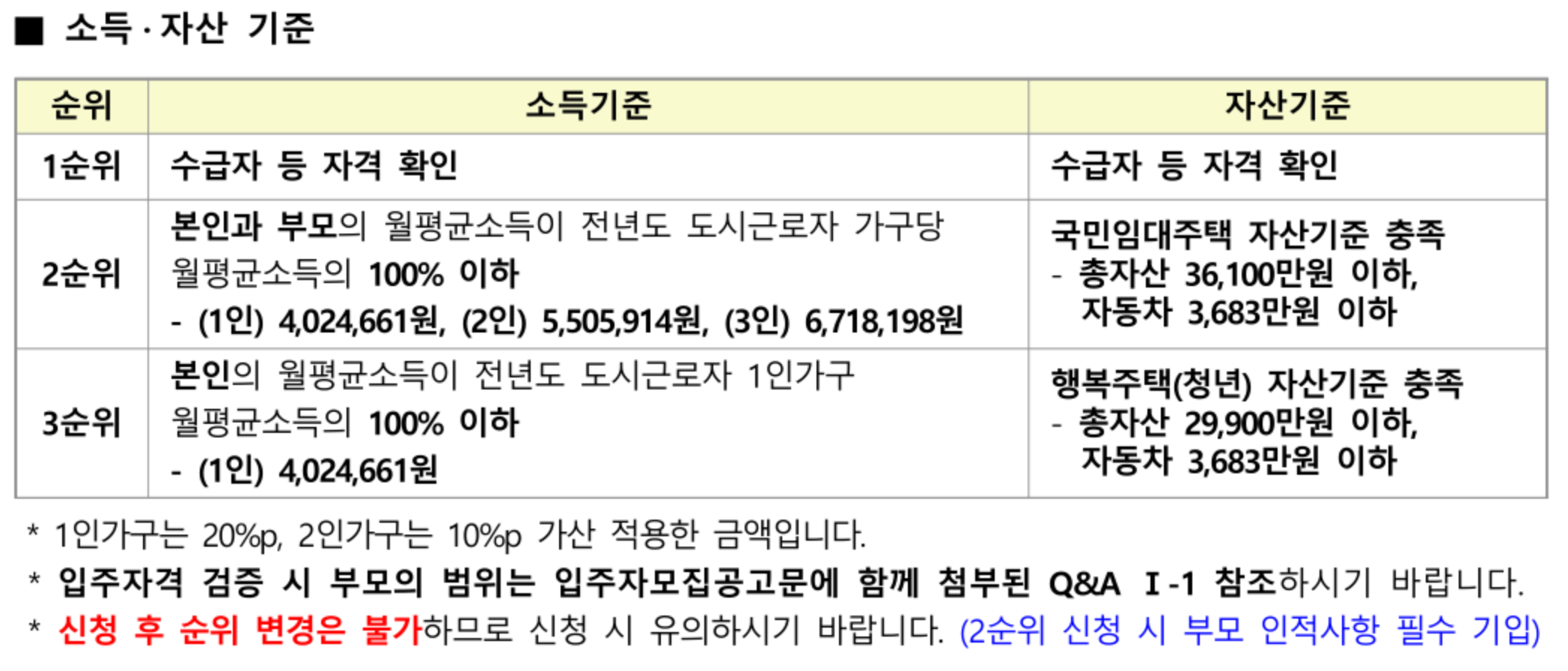 위에서 살펴보셨던 조건을 충족하는 경우에는 소득과 자산의 기준으로 아래와 같이 한 번 더 우선순위가 정해집니다.