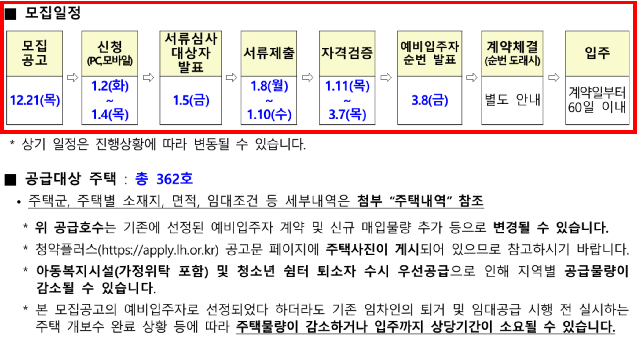 서류제출 후 자격검증을 거쳐 예비입주주 순번을 발표하고 본인 순번이 돌아오면 계약을 체결하고 입주를 하게 됩니다. 입주는 계약체결한 날부터 60일 이내에 가능합니다. 자세한 모집일정은 아래 사진을 참고하시길 바랍니다.